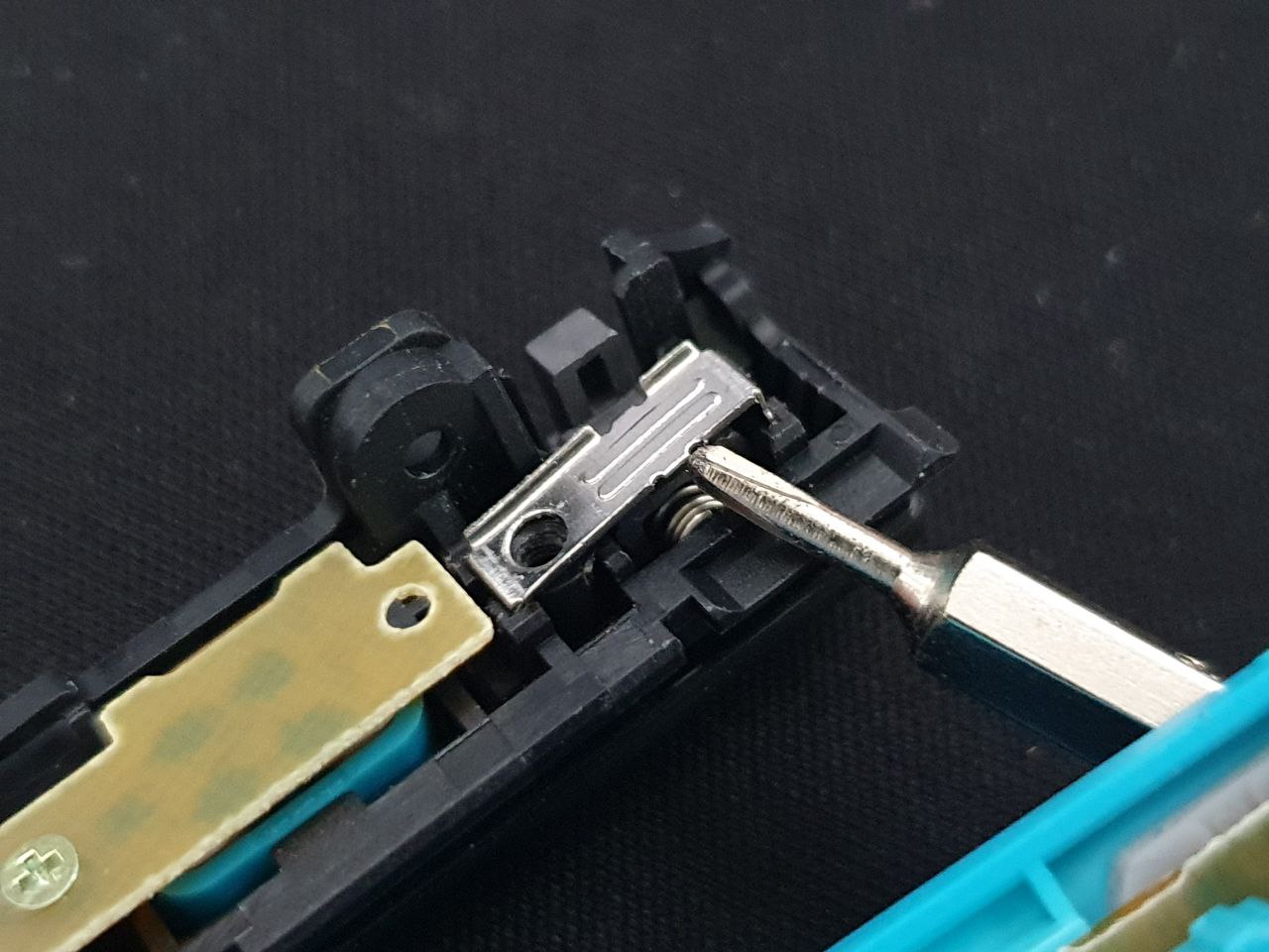 드라이버로 지렛대처럼 들어 올려서 제거. 걸쇠를 뺄 때 스프링이 도망 갈 수 있으니까 조심 해야 함.