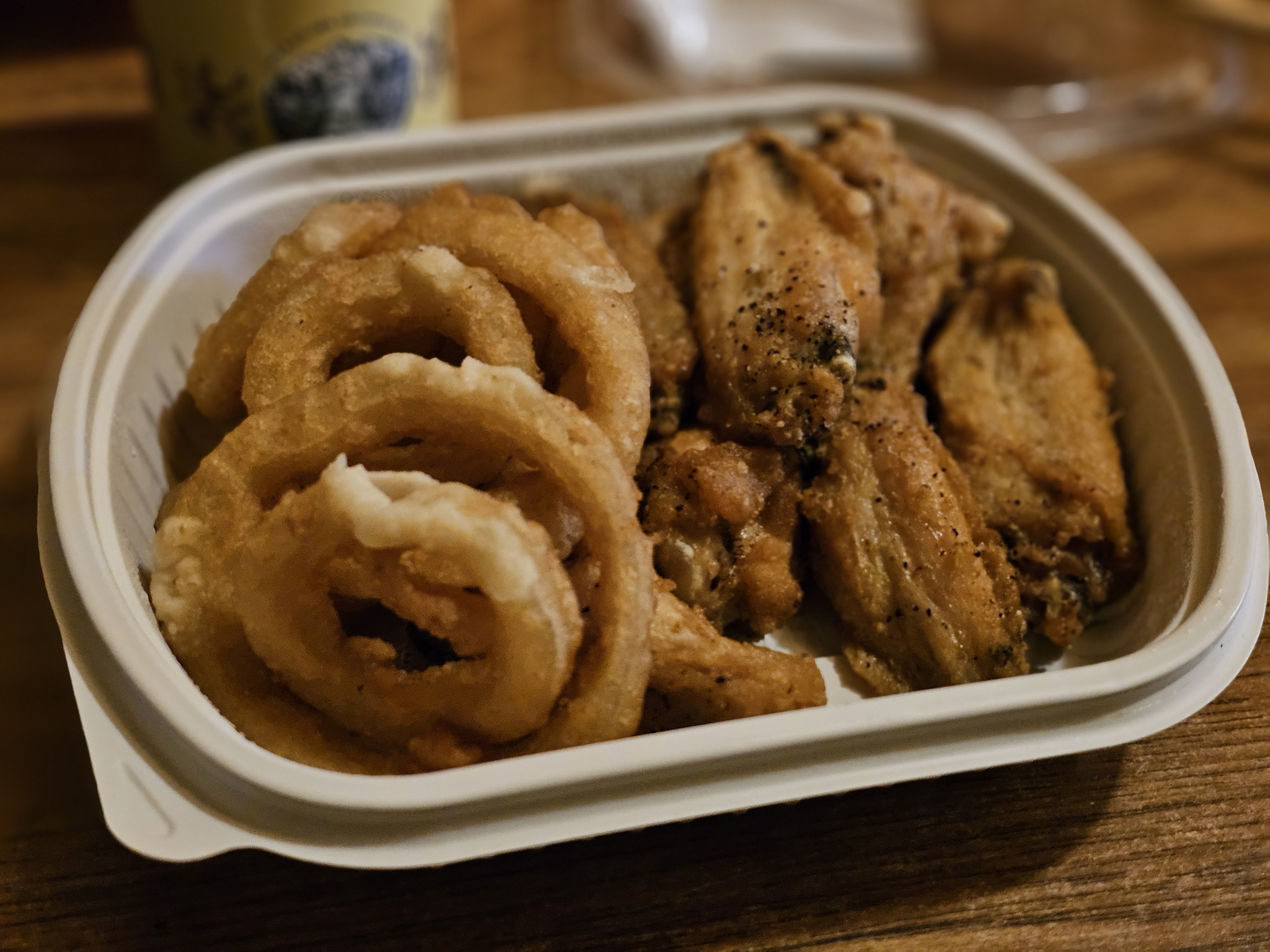 마트 가서 사온 축축한 어니언링, 치킨과 맥주로 하루 마무리.