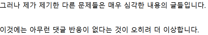 자기가 물타기, 프레임 전환 하려고 쓴 내용에 대해 아무도 댓글 없다는 게 오히려 더 이상하다고 함. 사람들이 바보도 아니고 개인정보 유출이랑 상관도 없고, 실체도 없고, 망상인지 아닌지 알 수 없는 쓸데 없는 얘기에 왜 관심을 보여야 하는지?