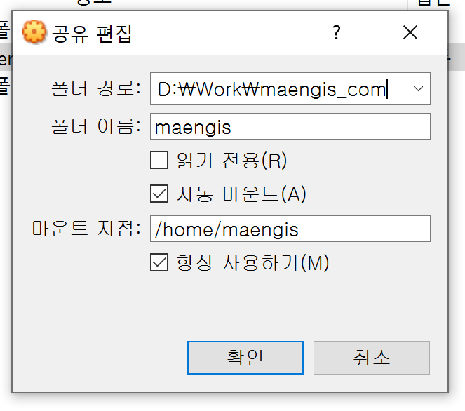 공유 폴더도 정상적으로 마운트 되었다. 전에는 마운트를 따로 해줘야 했었는데, 마운트 지점이란 게 생겨서 뭔가 했더니 알아서 마운트까지 해줬다. 별도로 마운트를 해줘야 한다면