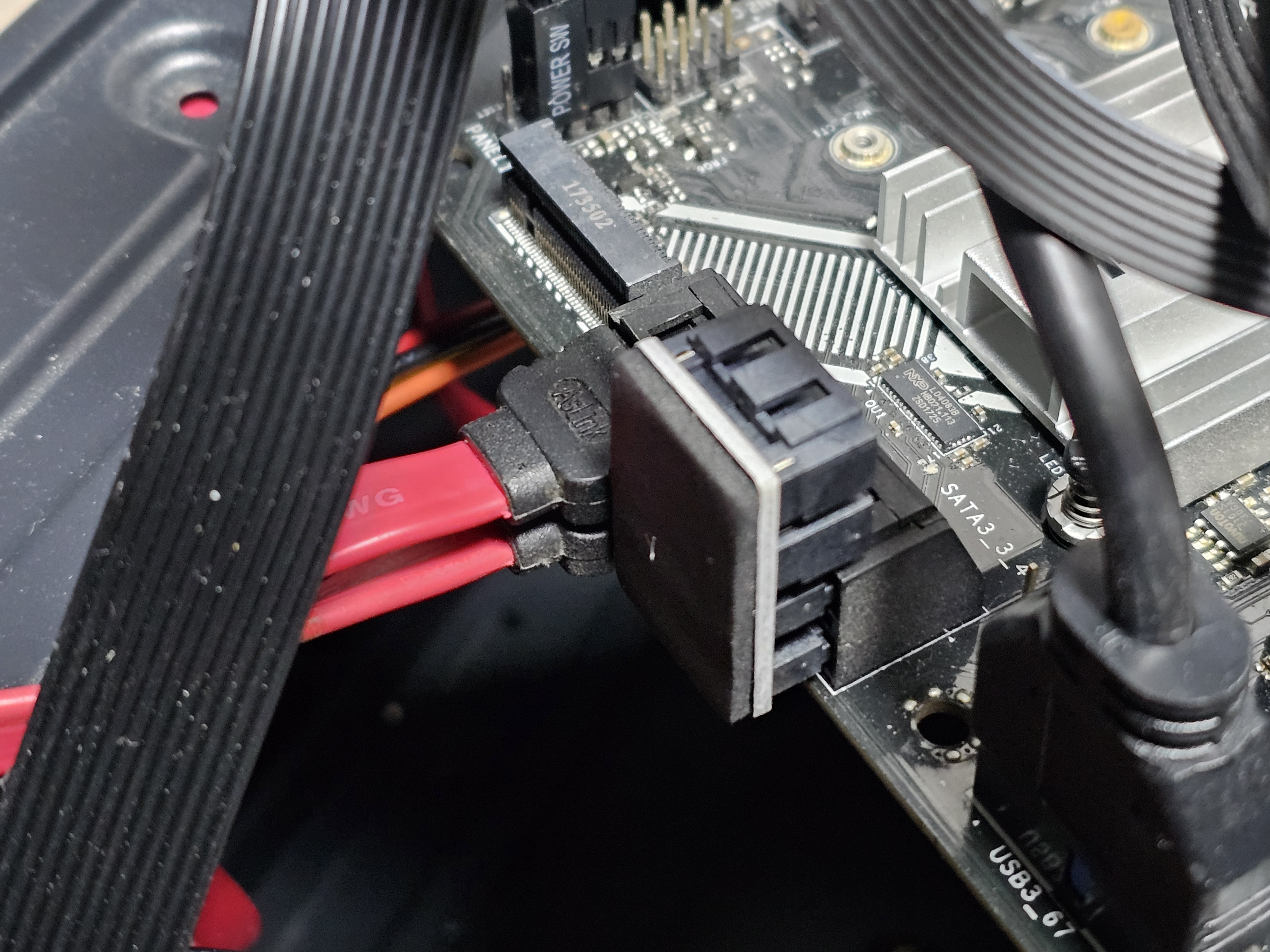 이 제품인데, 아래 사진처럼 SATA 케이블을 최대한 꺾을 수 있는 걸 골라서 일단 설치는 했었다. (케이스에 메인보드가 안 들어가서 메인보드 백패널도 제거 해야 했다.)