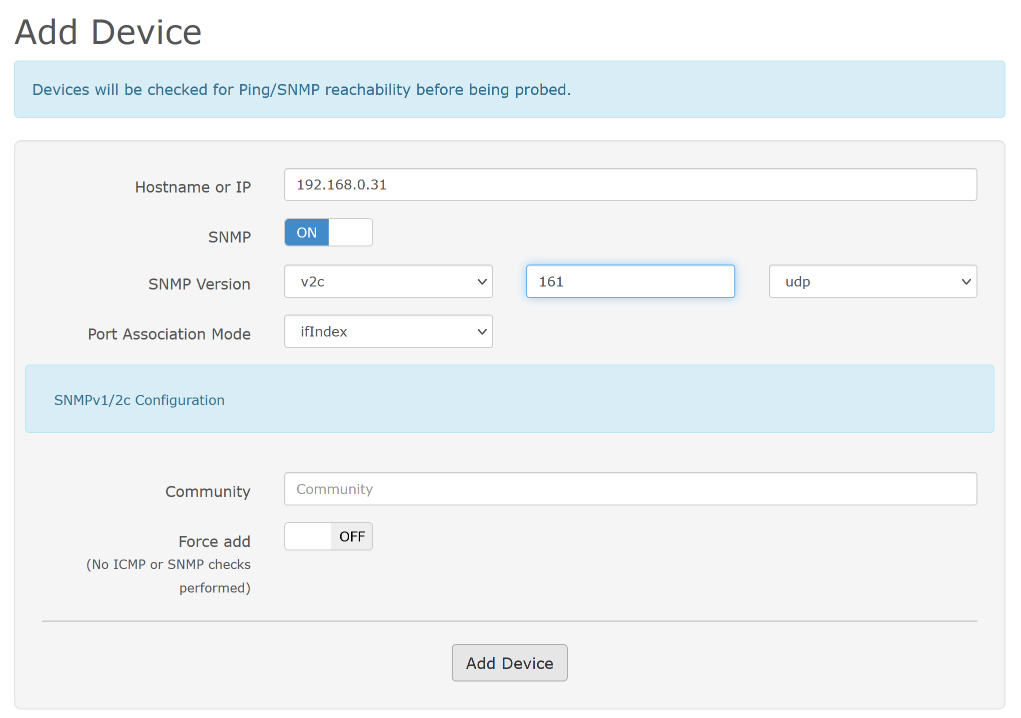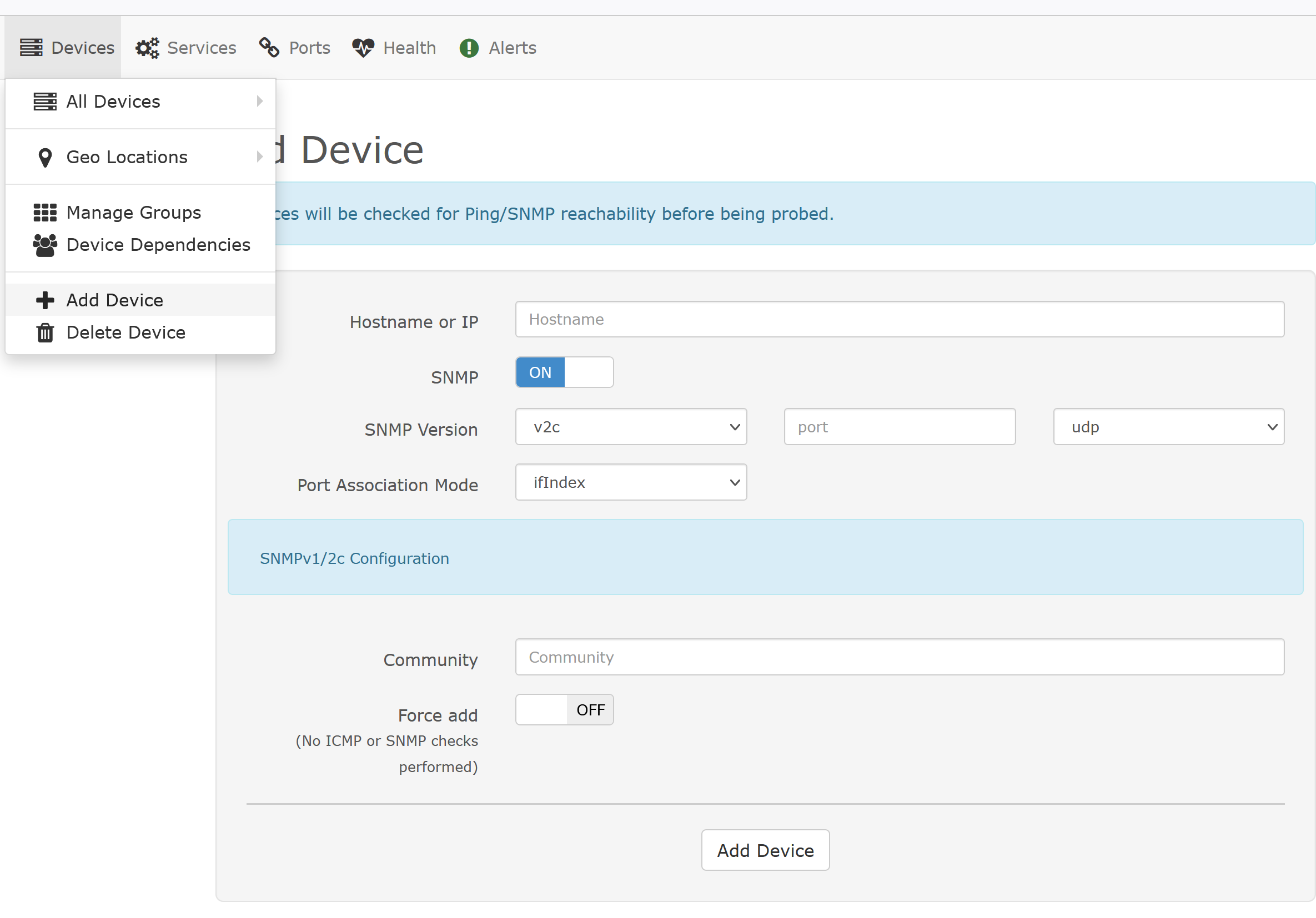 Devices > Add Device로 추가를 하면 되는 거 같은데, SNMP를 사용해야 된다고 한다.