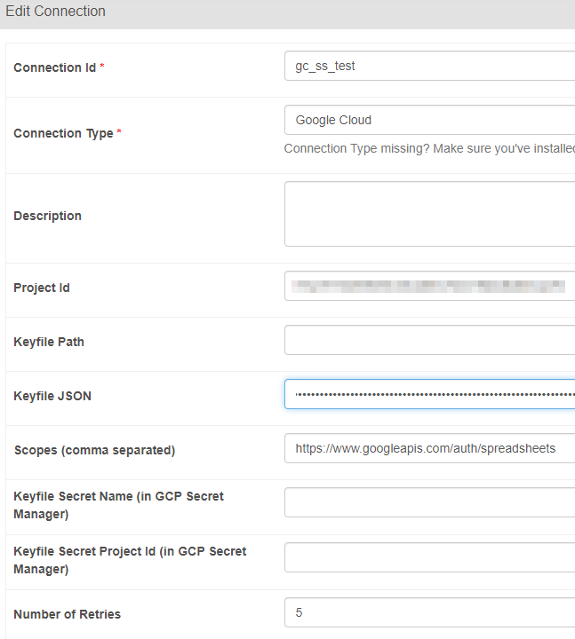 https://console.cloud.google.com/apis/credentials 프로젝트 선택 > 새 프로젝트 프로젝트 선택에서 생성한 프로젝트로 변경 > 사용자 인증 정보 > 서비스 계정 서비스 계정 > 생성한 계정 클릭 > 키 > 키 추가 > 새 키 만들기 > JSON JSON 파일이 받아짐. https://console.cloud.google.com/welcome 프로젝트 선택 API 및 서비스 > 라이브러리 sheet 검색 하여 구글시트 사용 drive 검색 하여 구글드라이브 사용 구글 드라이브에서 스프레드 만들고 공유에 프로젝트 생성하면서 구글에서 주는 이메일 주소 넣고 편집 권한으로 추가. 일단 커넥션 정보 등록. 내가 쓰는 에어플로우 환경은 K8s인데 JSON 파일 위치 넣고 적기가..